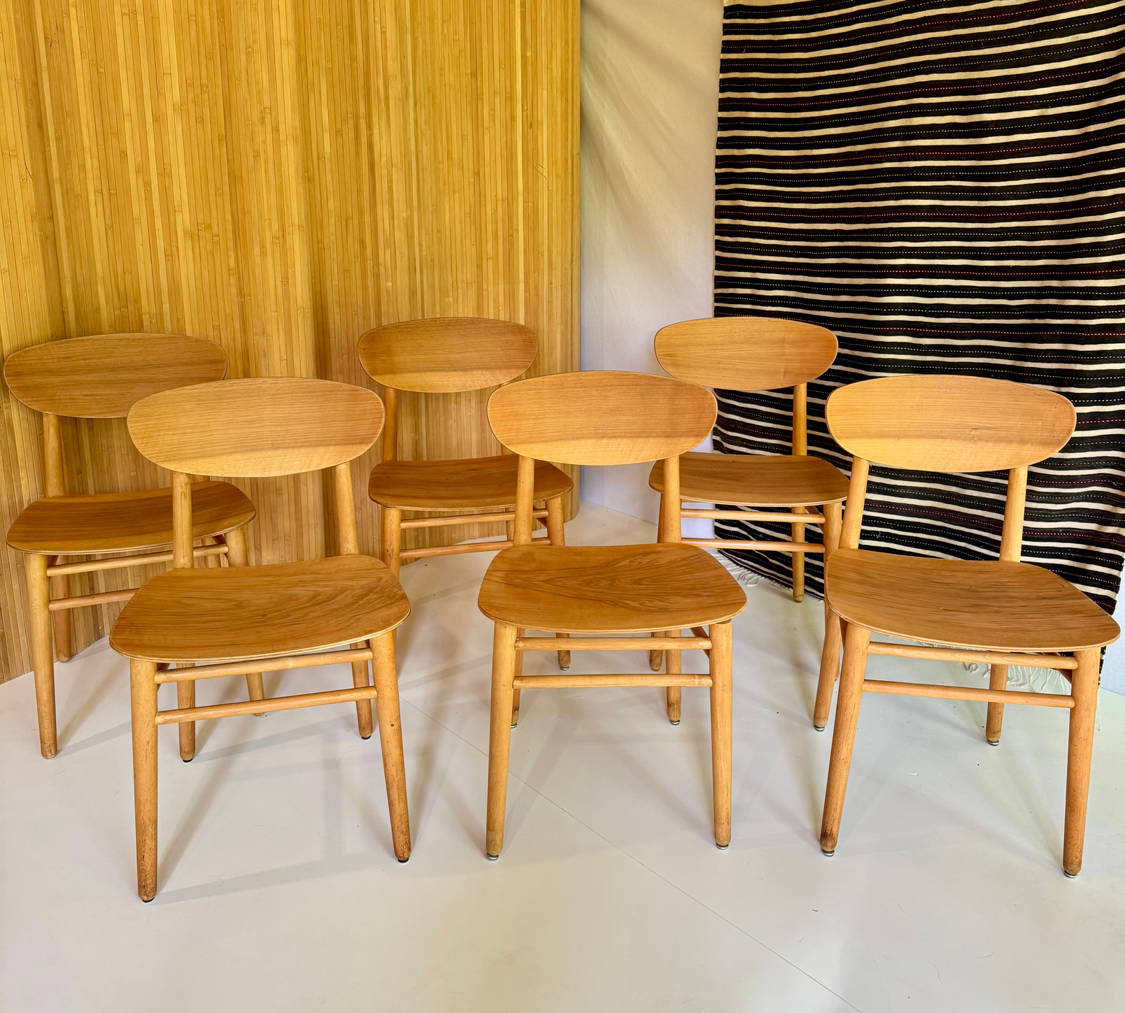 Six chaises en hêtre massif, assise et dossier en noyer.
