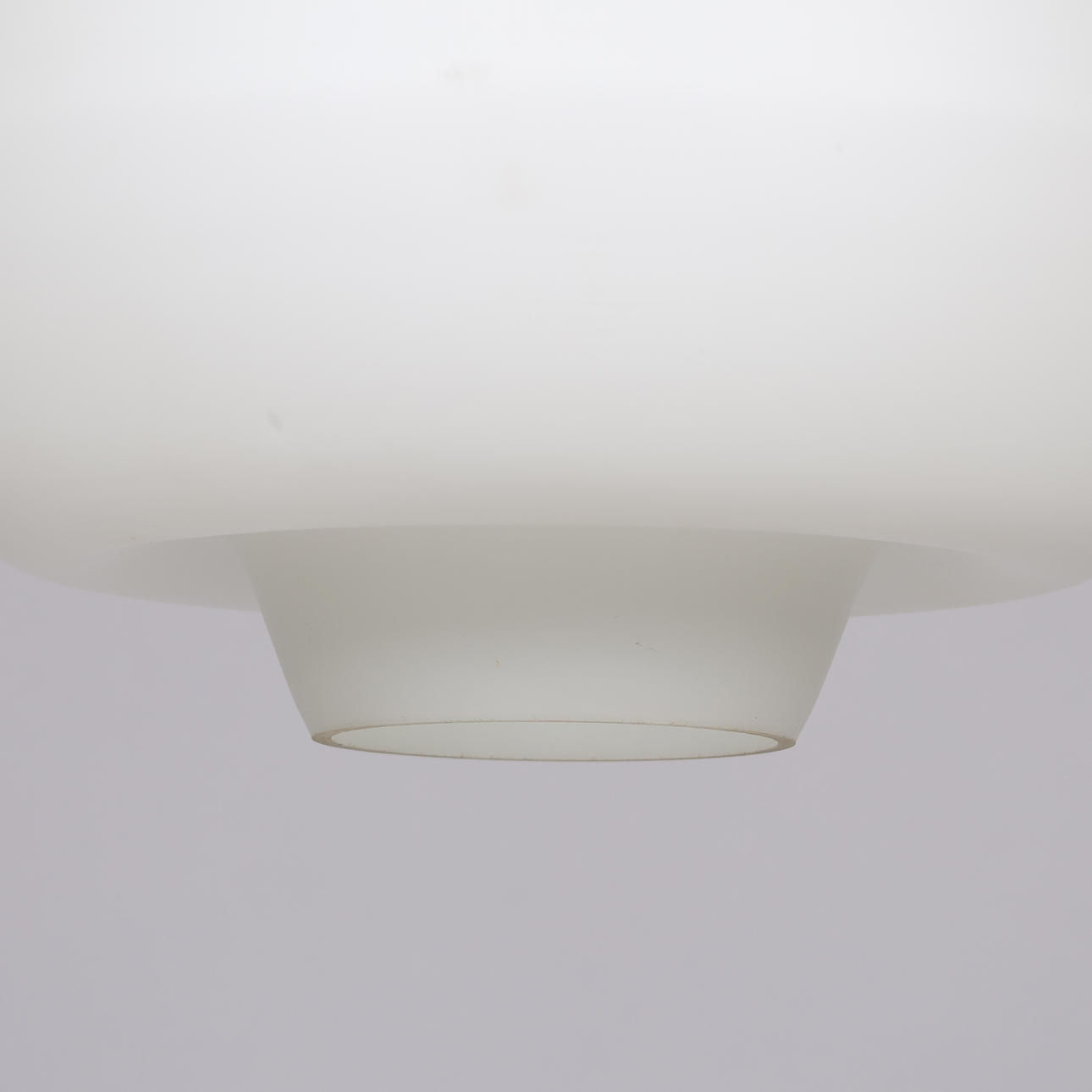 Globe en opaline, suspension en métal et embouts de câble en bois.